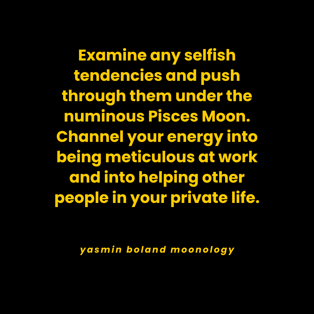 Examine any selfish tendencies and push through them under the numinous Pisces Moon. by Yasmin Boland | Jun 16, 2025 | Daily Moon Share this:Tweet Click to email a link to a friend (Opens in new window) Email Click to share on WhatsApp (Opens in new window) WhatsApp