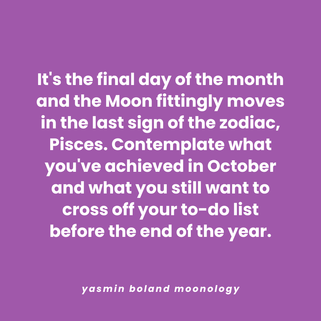It’s the final day of the month and the Moon by Yasmin Boland | Oct 30, 2025 | Daily Moon Share this:Tweet Click to email a link to a friend (Opens in new window) Email Click to share on WhatsApp (Opens in new window) WhatsApp