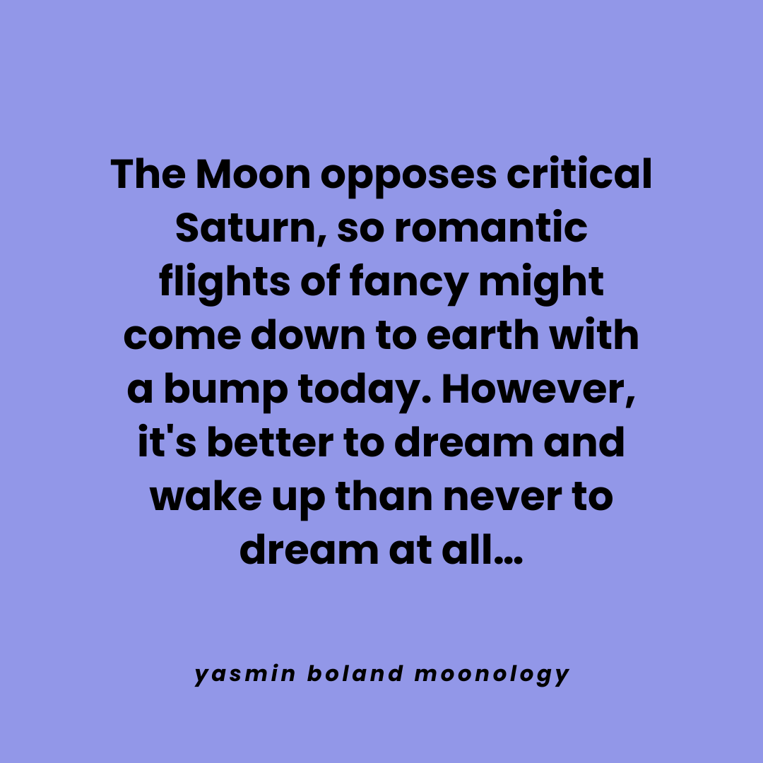 The Moon opposes critical Saturn, so romantic by Yasmin Boland | 3 hours ago | Daily Moon Share this:Tweet Email a link to a friend (Opens in new window) Email Share on WhatsApp (Opens in new window) WhatsApp