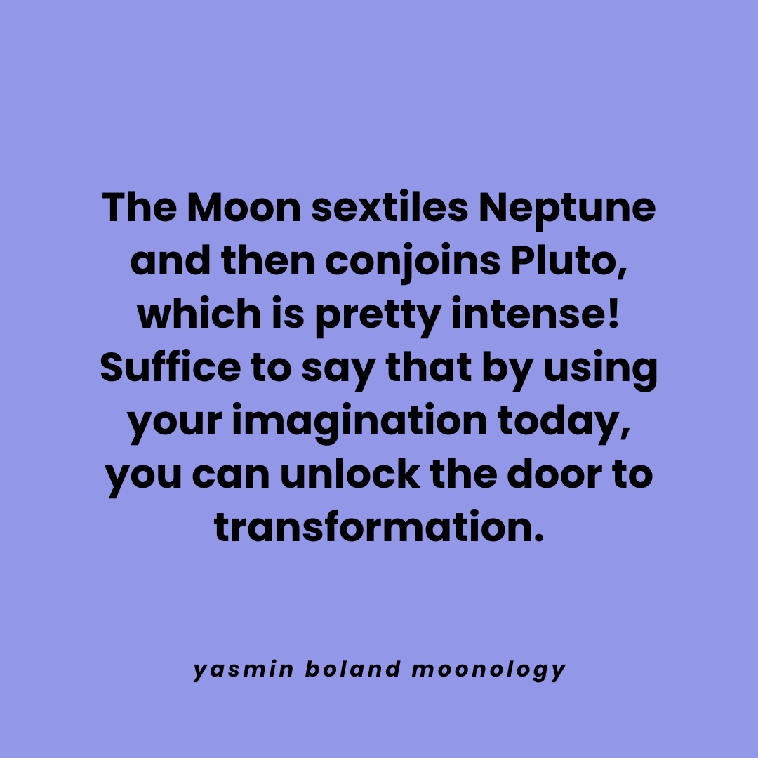 The Moon sextiles Neptune and then conjoins Pluto, by Yasmin Boland | 10 hours ago | Daily Moon Share this:Tweet Email a link to a friend (Opens in new window) Email Share on WhatsApp (Opens in new window) WhatsApp