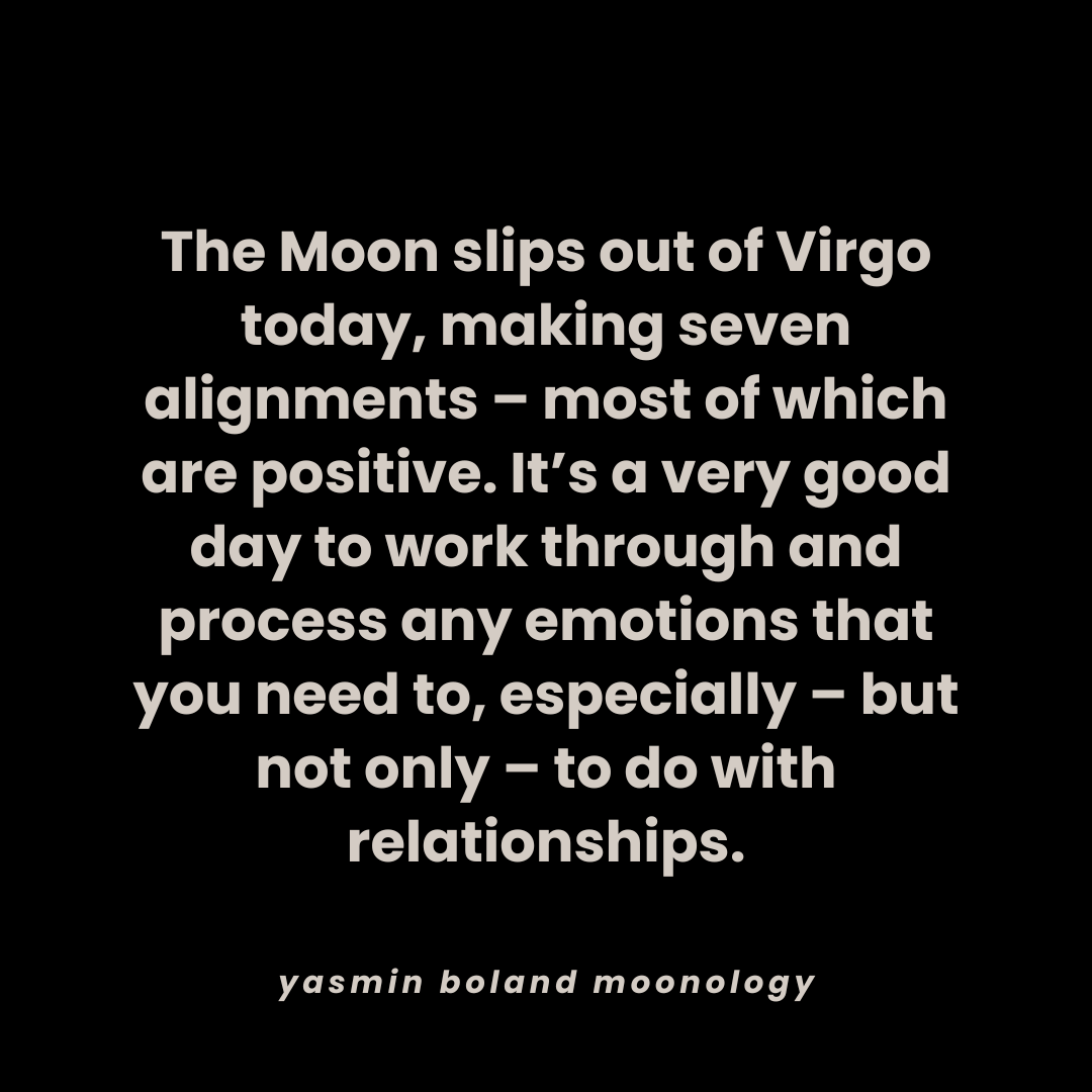 The Moon slips out of Virgo today, making seven alignments by Yasmin Boland | Nov 14, 2025 | Daily Moon Share this:Tweet Click to email a link to a friend (Opens in new window) Email Click to share on WhatsApp (Opens in new window) WhatsApp
