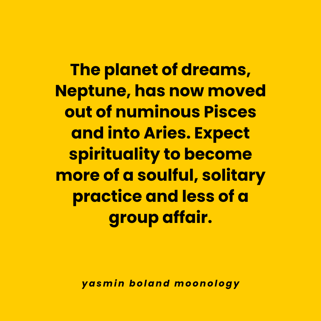The planet of dreams, Neptune, has now moved by Yasmin Boland | Mar 29, 2025 | Daily Moon Share this:Tweet Click to email a link to a friend (Opens in new window) Email Click to share on WhatsApp (Opens in new window) WhatsApp