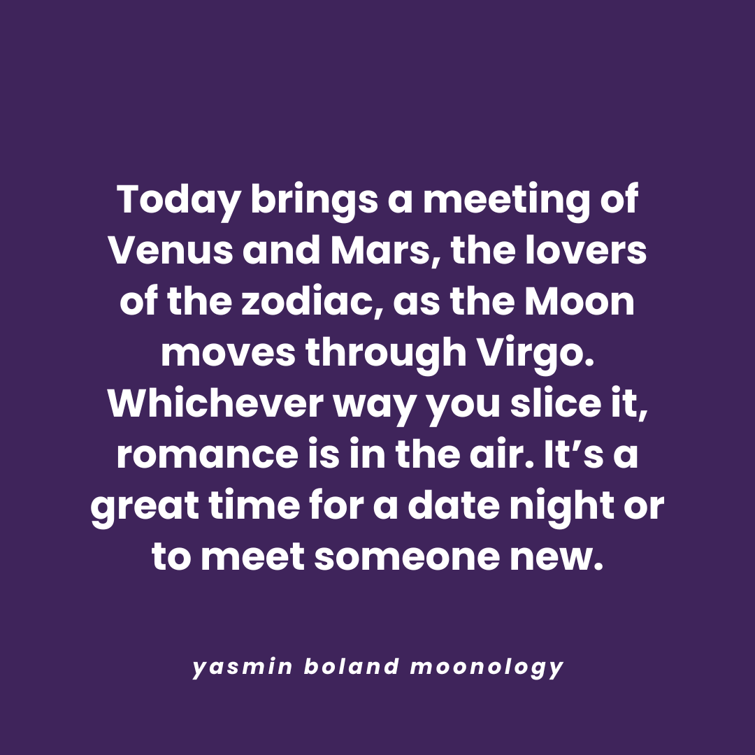 Today brings a meeting of Venus and Mars, by Yasmin Boland | 1 day ago | Daily Moon Share this:Tweet Click to email a link to a friend (Opens in new window) Email Click to share on WhatsApp (Opens in new window) WhatsApp