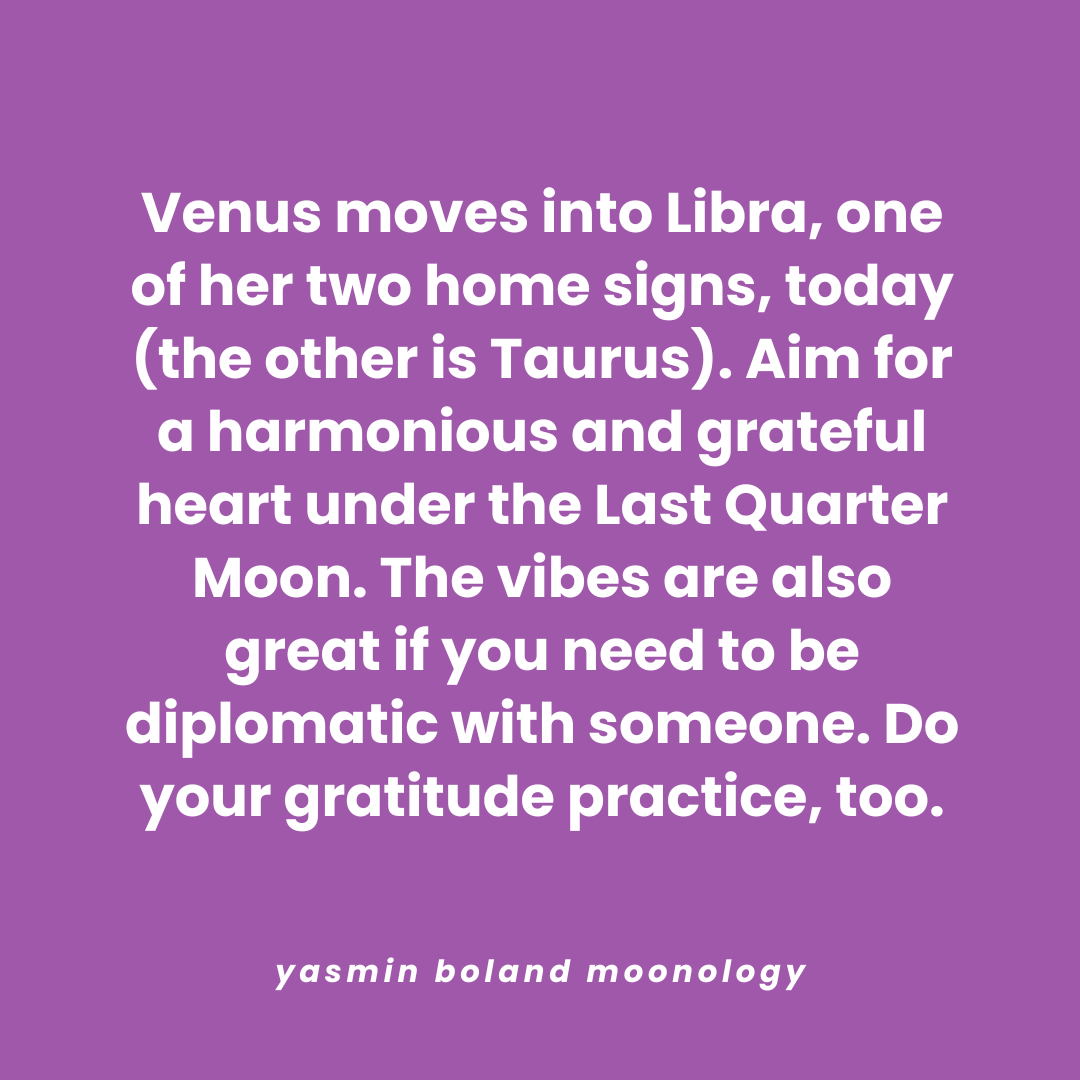 Venus moves into Libra, one of her two home signs, today by Yasmin Boland | Oct 12, 2025 | Daily Moon Share this:Tweet Click to email a link to a friend (Opens in new window) Email Click to share on WhatsApp (Opens in new window) WhatsApp